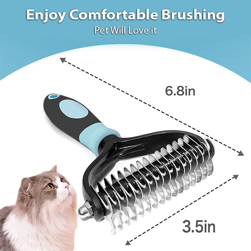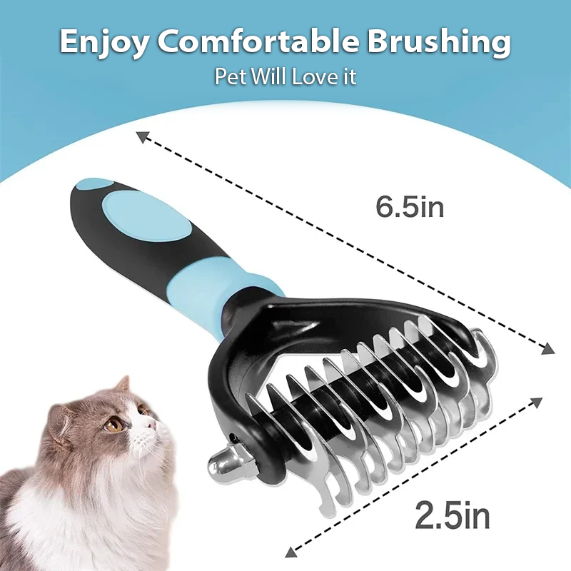 Our pet grooming tool not only works great as a dematting brush or detangling comb, you can also use it as an undercoat comb or deshedding rake. This cat and dog comb can cut a matt or tangle then be used as a deshedding brush or deshedding comb.